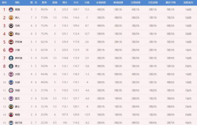 雷霆的實力毋庸置疑,他們也是本賽季總冠軍最大的熱門,綜合實力太強了。我們看一下這支球隊的各項數據,戰績是9勝1負,勝率高達90%,擊敗的對手中有火箭、步行者、快船、國王等季后賽級別的球隊。雷霆場均得分是123.2,高居聯盟第3;場均失分109.7,高居聯盟第2;防守效率104.8,是聯盟第1。從這一組數據來看,這是一支攻防俱佳的強隊。還有,他們限制對手命中率是42.2%,也是聯盟第1;利用對手失誤得分24.7分,同樣是聯盟第1,由此可見防守的強度和攻防轉換的能力,令人嘆為觀止。