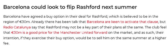 加泰羅尼亞電臺宣稱,巴薩擁有3000萬歐元買斷拉什福德的選項,考慮到他本賽季的表現,拉波爾塔和管理團隊覺得,簽下他之后可以轉手賣掉,價格可能遠高于這個數字!