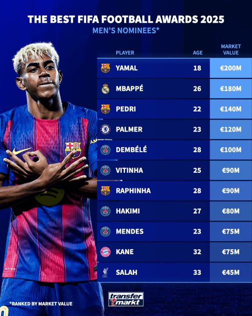 FIFA最佳球員候選身價:亞馬爾2億領跑 薩拉赫凱恩墊底