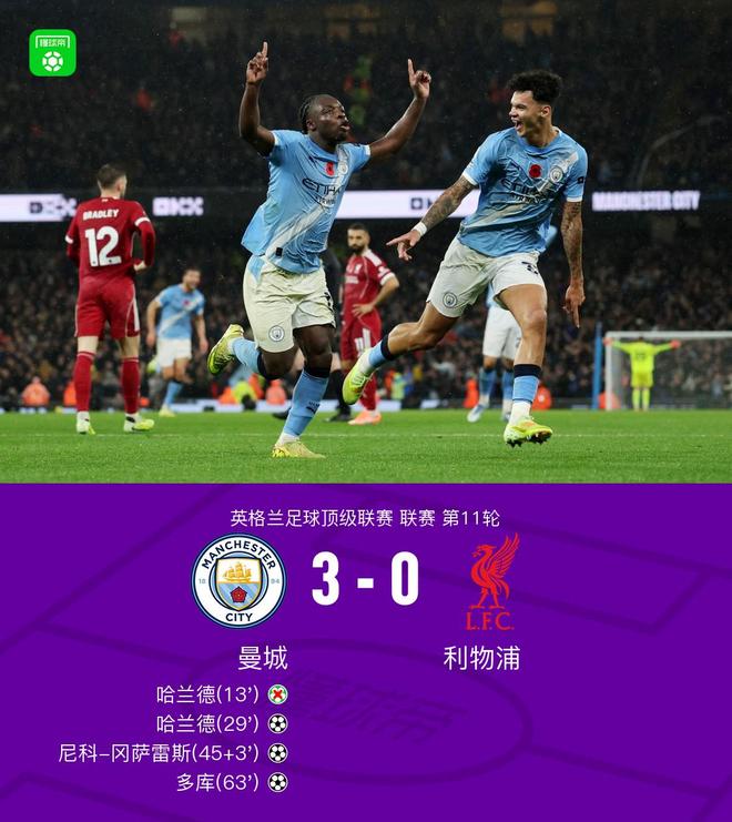 北京時間11月10日,英格蘭足球超級聯(lián)賽第11輪,曼城坐鎮(zhèn)主場迎戰(zhàn)利物浦。比賽中,哈蘭德主罰點球未能命中,但隨后迅速調整狀態(tài),接馬特烏斯-努內斯助攻成功破門,為球隊打開勝利之門。上半場補時階段,伯納多-席爾瓦送出精準傳球,尼科-岡薩雷斯跟進得分,進一步擴大領先優(yōu)勢。易邊再戰(zhàn),尼科-奧賴利送出關鍵助攻,多庫冷靜施射建功,將比分鎖定為3比0。最終,曼城在主場以三球完勝利物浦,全取三分。